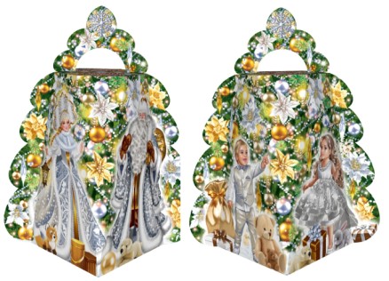 Елка большая «Золотой Шарм» Микрогофрокартон УФ-лак + глиттерный лак (блёстки) Вместимость 1600-1800гр Размер 285х200х350мм |